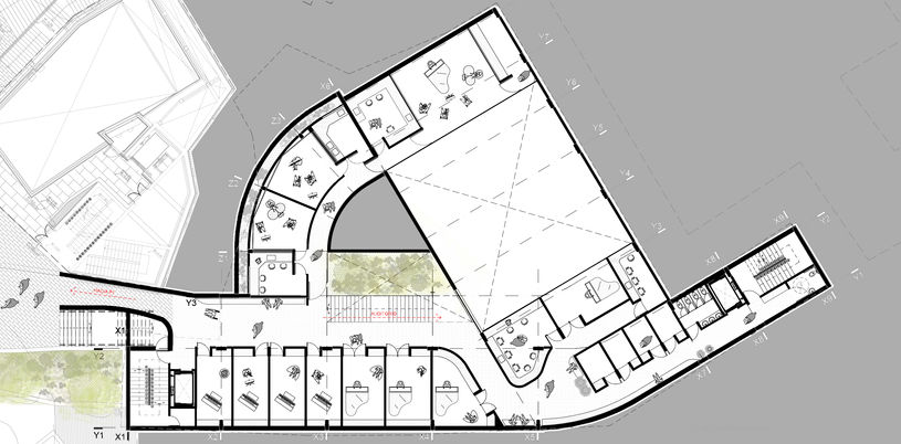 El edificio se implanta como una Barra delgada y esbelta que ABRAZA el costado oriental de La Plaza, CONFORMANDO y delimitando su espacio, albergando las partes del programa “de Luz” (espacios con necesidad de luz natural y vista) y una terraza en cubierta, los cuales gozan de una vista cercana hacia la propia plaza y vistas lejanas hacia los cerros y el Campus.. OBSERVAR.